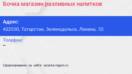 Бочка, магазин разливных напитков по адресу 422550, Татарстан, Зеленодольск, Ленина, 55 в дальнейшем Организация, размещена в следующих категориях: