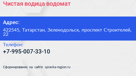 Чистая водица, водомат по адресу 422545, Татарстан, Зеленодольск, проспект Строителей, 22 в дальнейшем Организация, размещена в следующих категориях: