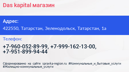 Das kapital, магазин по адресу 422550, Татарстан, Зеленодольск, Татарстан, 1а в дальнейшем Организация, размещена в следующих категориях: