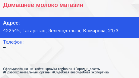 Домашнее молоко, магазин по адресу 422545, Татарстан, Зеленодольск, Комарова, 21/3 в дальнейшем Организация, размещена в следующих категориях: