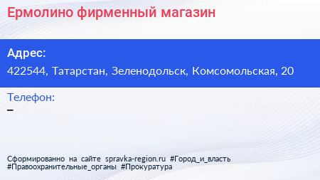 Ермолино, фирменный магазин по адресу 422544, Татарстан, Зеленодольск, Комсомольская, 20 в дальнейшем Организация, размещена в следующих категориях: