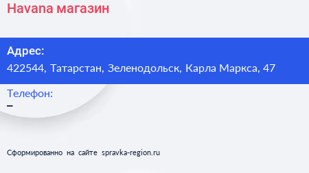 Havana, магазин по адресу 422544, Татарстан, Зеленодольск, Карла Маркса, 47 в дальнейшем Организация, размещена в следующих категориях: