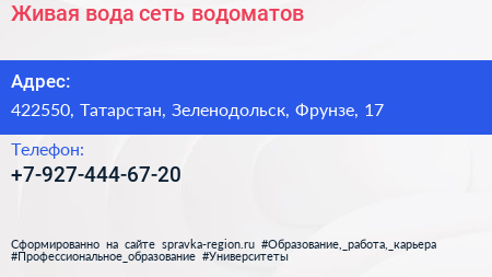 Живая вода, сеть водоматов по адресу 422550, Татарстан, Зеленодольск, Фрунзе, 17 в дальнейшем Организация, размещена в следующих категориях: