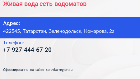 Живая вода, сеть водоматов по адресу 422545, Татарстан, Зеленодольск, Комарова, 2а в дальнейшем Организация, размещена в следующих категориях: