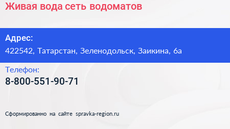 Живая вода, сеть водоматов по адресу 422542, Татарстан, Зеленодольск, Заикина, 6а в дальнейшем Организация, размещена в следующих категориях: