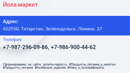 Йола-маркет по адресу 422550, Татарстан, Зеленодольск, Ленина, 27 в дальнейшем Организация, размещена в следующих категориях: