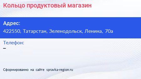 Кольцо, продуктовый магазин по адресу 422550, Татарстан, Зеленодольск, Ленина, 70а в дальнейшем Организация, размещена в следующих категориях: