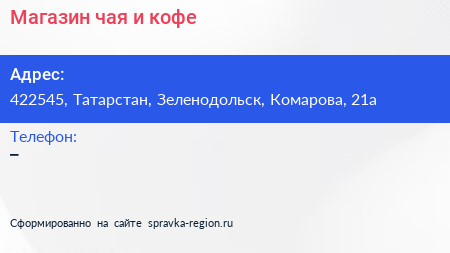 Магазин чая и кофе по адресу 422545, Татарстан, Зеленодольск, Комарова, 21а в дальнейшем Организация, размещена в следующих категориях: