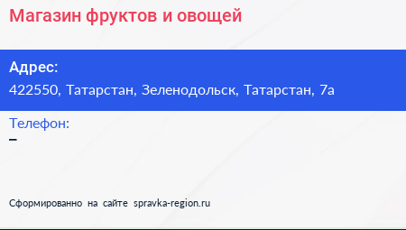 Магазин фруктов и овощей по адресу 422550, Татарстан, Зеленодольск, Татарстан, 7а в дальнейшем Организация, размещена в следующих категориях: