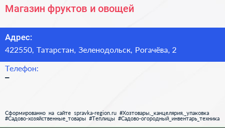 Магазин фруктов и овощей по адресу 422550, Татарстан, Зеленодольск, Рогачёва, 2 в дальнейшем Организация, размещена в следующих категориях: