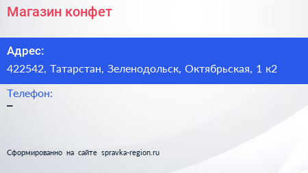 Магазин конфет по адресу 422542, Татарстан, Зеленодольск, Октябрьская, 1 к2 в дальнейшем Организация, размещена в следующих категориях: