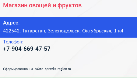Магазин овощей и фруктов по адресу 422542, Татарстан, Зеленодольск, Октябрьская, 1 к4 в дальнейшем Организация, размещена в следующих категориях: