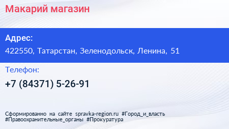 Макарий, магазин по адресу 422550, Татарстан, Зеленодольск, Ленина, 51 в дальнейшем Организация, размещена в следующих категориях:
