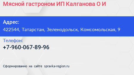 Мясной гастроном, ИП Калганова О.И. по адресу 422544, Татарстан, Зеленодольск, Комсомольская, 9 в дальнейшем Организация, размещена в следующих категориях:
