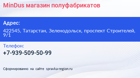 MinDus, магазин полуфабрикатов по адресу 422545, Татарстан, Зеленодольск, проспект Строителей, 9/1 в дальнейшем Организация, размещена в следующих категориях: