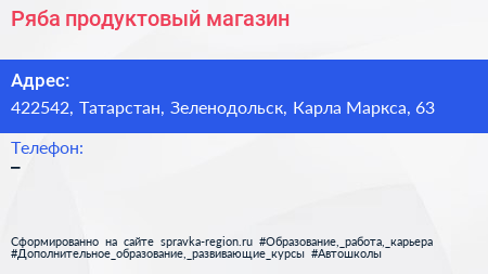 Ряба, продуктовый магазин по адресу 422542, Татарстан, Зеленодольск, Карла Маркса, 63 в дальнейшем Организация, размещена в следующих категориях: