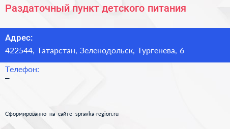 Раздаточный пункт детского питания по адресу 422544, Татарстан, Зеленодольск, Тургенева, 6 в дальнейшем Организация, размещена в следующих категориях: