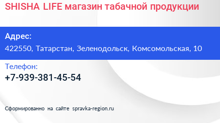 SHISHA LIFE, магазин табачной продукции по адресу 422550, Татарстан, Зеленодольск, Комсомольская, 10 в дальнейшем Организация, размещена в следующих категориях: