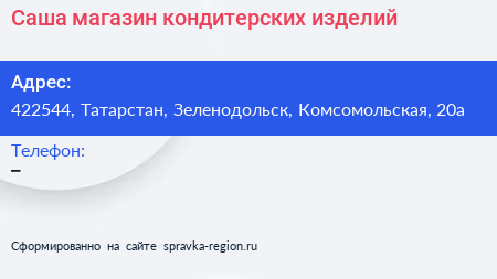 Саша, магазин кондитерских изделий по адресу 422544, Татарстан, Зеленодольск, Комсомольская, 20а в дальнейшем Организация, размещена в следующих категориях: