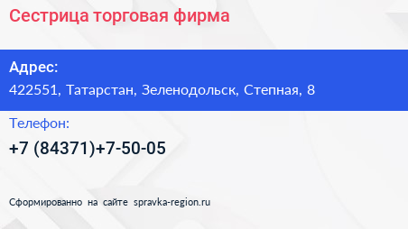 Сестрица, торговая фирма по адресу 422551, Татарстан, Зеленодольск, Степная, 8 в дальнейшем Организация, размещена в следующих категориях: