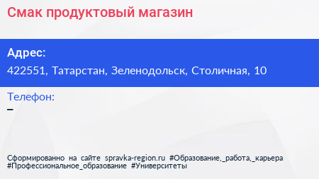 Смак, продуктовый магазин по адресу 422551, Татарстан, Зеленодольск, Столичная, 10 в дальнейшем Организация, размещена в следующих категориях: