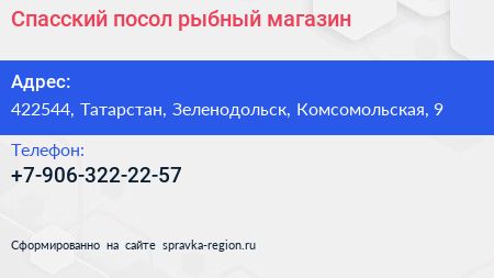 Спасский посол, рыбный магазин по адресу 422544, Татарстан, Зеленодольск, Комсомольская, 9 в дальнейшем Организация, размещена в следующих категориях: