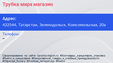 Трубка мира, магазин по адресу 422544, Татарстан, Зеленодольск, Комсомольская, 20а в дальнейшем Организация, размещена в следующих категориях: