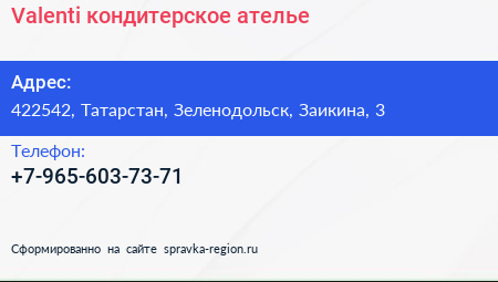 Valenti, кондитерское ателье по адресу 422542, Татарстан, Зеленодольск, Заикина, 3 в дальнейшем Организация, размещена в следующих категориях: