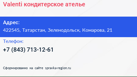 Valenti, кондитерское ателье по адресу 422545, Татарстан, Зеленодольск, Комарова, 21 в дальнейшем Организация, размещена в следующих категориях: