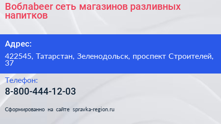 Воблаbeer, сеть магазинов разливных напитков по адресу 422545, Татарстан, Зеленодольск, проспект Строителей, 37 в дальнейшем Организация, размещена в следующих категориях: