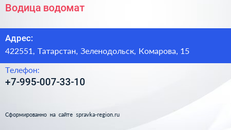 Водица, водомат по адресу 422551, Татарстан, Зеленодольск, Комарова, 15 в дальнейшем Организация, размещена в следующих категориях: