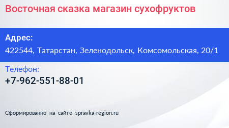 Восточная сказка, магазин сухофруктов по адресу 422544, Татарстан, Зеленодольск, Комсомольская, 20/1 в дальнейшем Организация, размещена в следующих категориях: