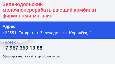 Зеленодольский молочноперерабатывающий комбинат, фирменный магазин по адресу 422551, Татарстан, Зеленодольск, Королёва, 4 в дальнейшем Организация, размещена в следующих категориях: