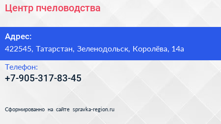 Центр пчеловодства по адресу 422545, Татарстан, Зеленодольск, Королёва, 14а в дальнейшем Организация, размещена в следующих категориях: