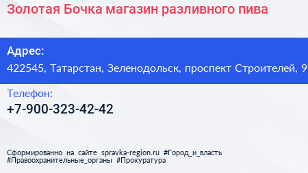 Золотая Бочка, магазин разливного пива по адресу 422545, Татарстан, Зеленодольск, проспект Строителей, 9 в дальнейшем Организация, размещена в следующих категориях: