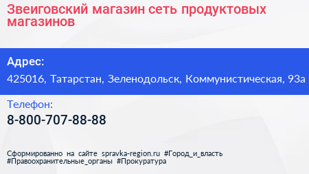 Звеиговский магазин, сеть продуктовых магазинов по адресу 425016, Татарстан, Зеленодольск, Коммунистическая, 93а в дальнейшем Организация, размещена в следующих категориях: