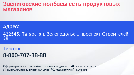 Звениговские колбасы, сеть продуктовых магазинов по адресу 422545, Татарстан, Зеленодольск, проспект Строителей, 38 в дальнейшем Организация, размещена в следующих категориях: