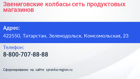 Звениговские колбасы, сеть продуктовых магазинов по адресу 422550, Татарстан, Зеленодольск, Комсомольская, 23 в дальнейшем Организация, размещена в следующих категориях: