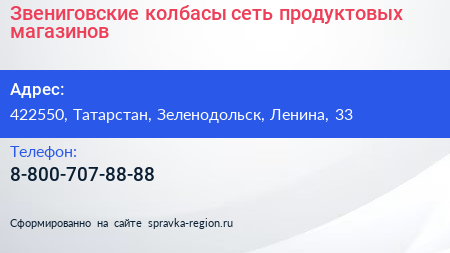 Звениговские колбасы, сеть продуктовых магазинов по адресу 422550, Татарстан, Зеленодольск, Ленина, 33 в дальнейшем Организация, размещена в следующих категориях: