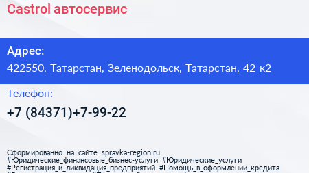 Castrol, автосервис по адресу 422550, Татарстан, Зеленодольск, Татарстан, 42 к2 в дальнейшем Организация, размещена в следующих категориях:
