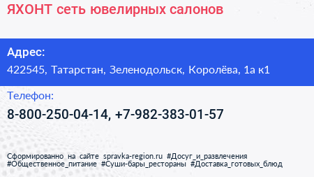 ЯХОНТ, сеть ювелирных салонов по адресу 422545, Татарстан, Зеленодольск, Королёва, 1а к1 в дальнейшем Организация, размещена в следующих категориях: