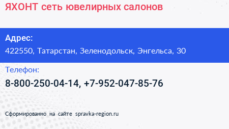 ЯХОНТ, сеть ювелирных салонов по адресу 422550, Татарстан, Зеленодольск, Энгельса, 30 в дальнейшем Организация, размещена в следующих категориях: