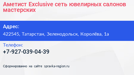 Аметист Exclusive, сеть ювелирных салонов-мастерских по адресу 422545, Татарстан, Зеленодольск, Королёва, 1а в дальнейшем Организация, размещена в следующих категориях: