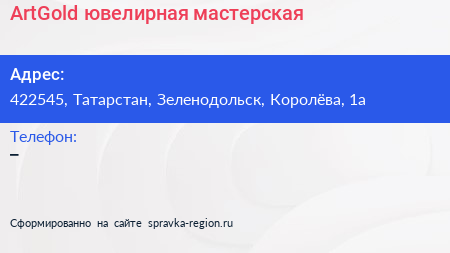ArtGold, ювелирная мастерская по адресу 422545, Татарстан, Зеленодольск, Королёва, 1а в дальнейшем Организация, размещена в следующих категориях:
