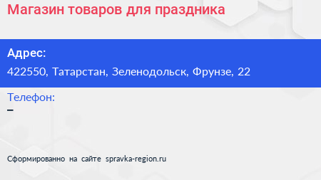 Магазин товаров для праздника по адресу 422550, Татарстан, Зеленодольск, Фрунзе, 22 в дальнейшем Организация, размещена в следующих категориях: