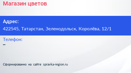 Магазин цветов по адресу 422545, Татарстан, Зеленодольск, Королёва, 12/1 в дальнейшем Организация, размещена в следующих категориях: