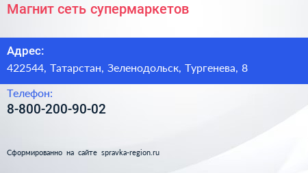 Магнит, сеть супермаркетов по адресу 422544, Татарстан, Зеленодольск, Тургенева, 8 в дальнейшем Организация, размещена в следующих категориях: