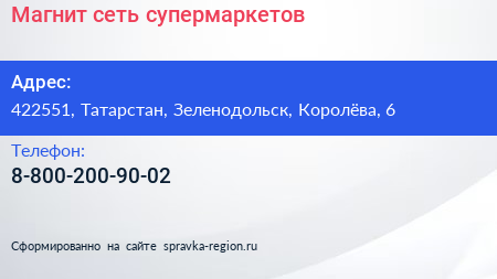 Магнит, сеть супермаркетов по адресу 422551, Татарстан, Зеленодольск, Королёва, 6 в дальнейшем Организация, размещена в следующих категориях: