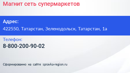 Магнит, сеть супермаркетов по адресу 422550, Татарстан, Зеленодольск, Татарстан, 1а в дальнейшем Организация, размещена в следующих категориях: