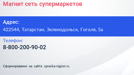 Магнит, сеть супермаркетов по адресу 422544, Татарстан, Зеленодольск, Гоголя, 5а в дальнейшем Организация, размещена в следующих категориях: